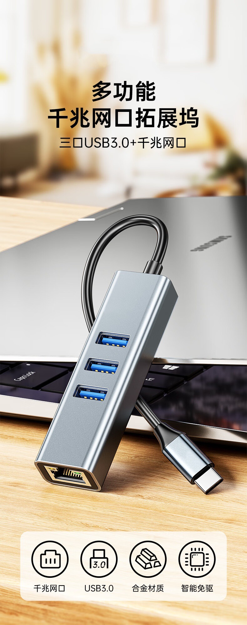 产品名称:Type-C转千兆网口+USB3.0*3