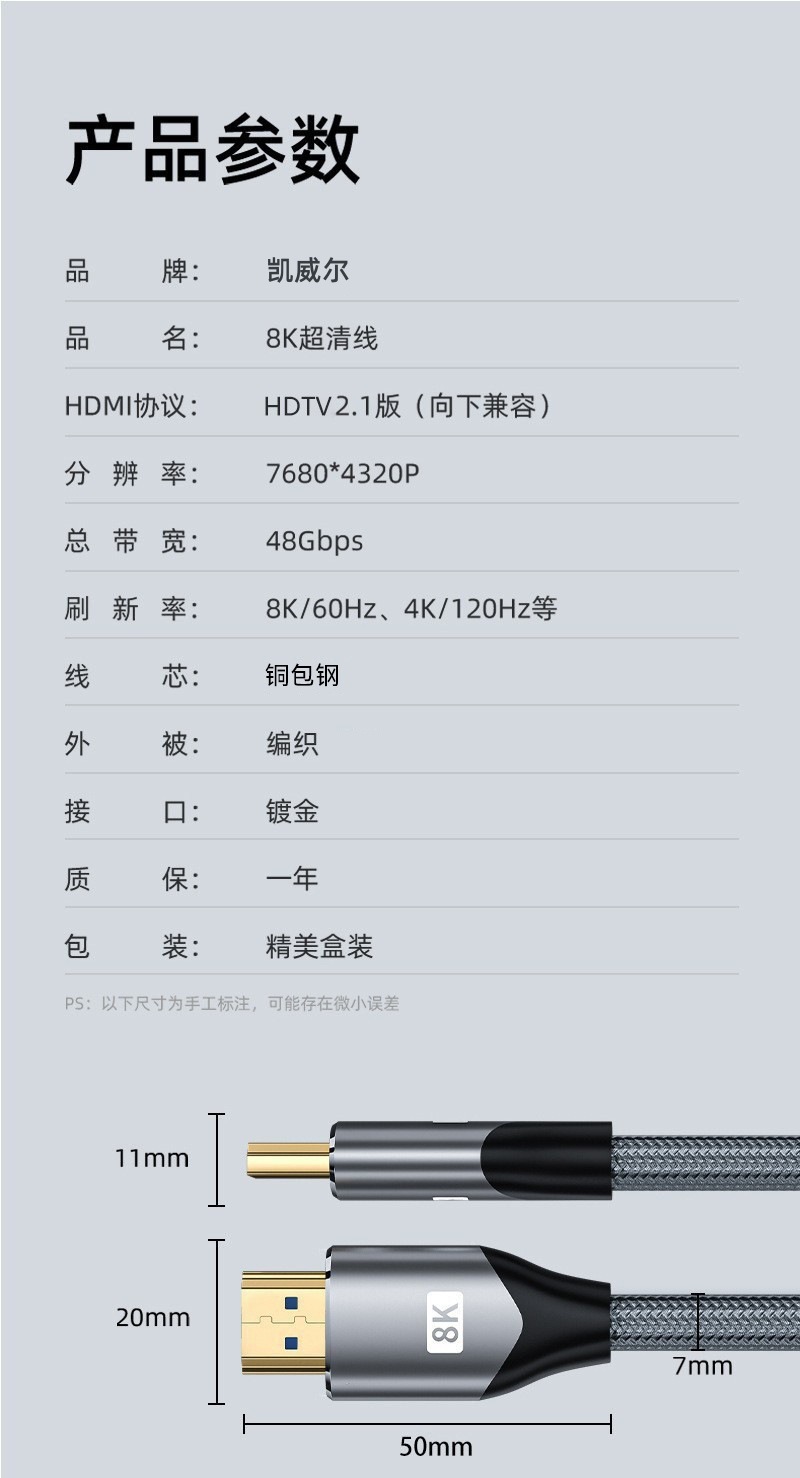 产品名称:棉网款HDMI线2.1版8k60Hz视频连接线