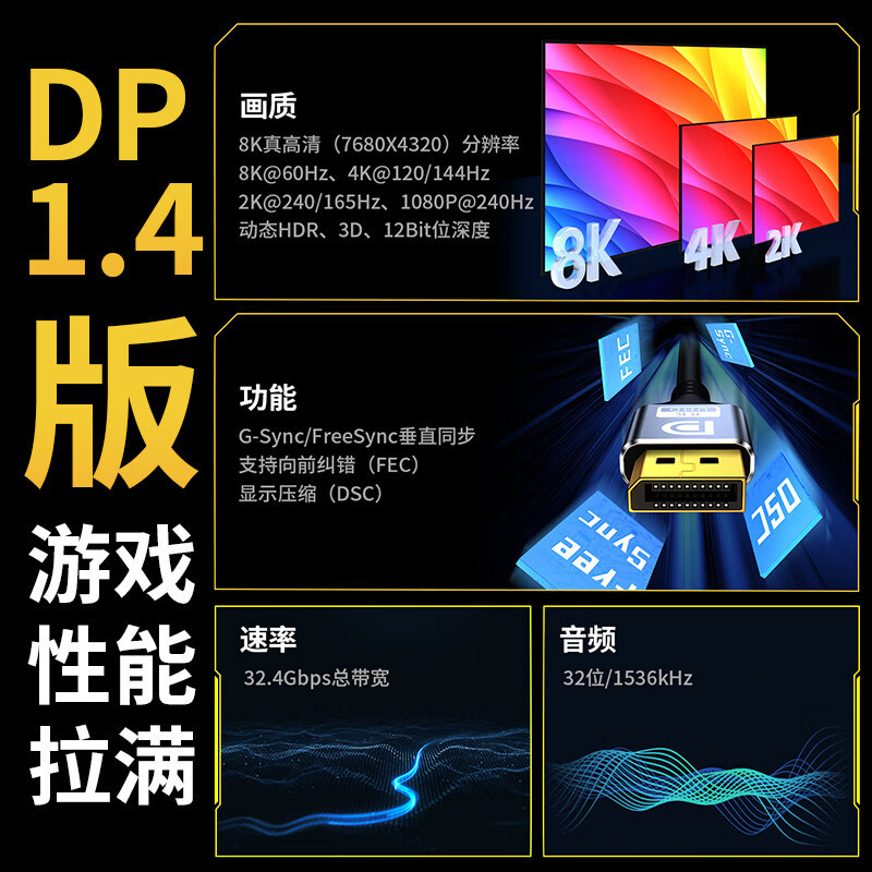 支持分辨率:8k60Hz,4k144Hz,2k240Hz