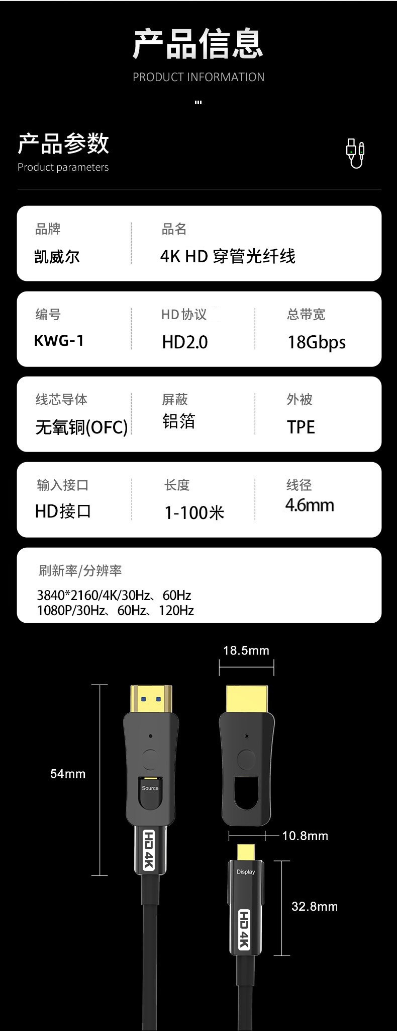 产品名称:分离式光纤HDMI线2.0版4k60Hz视频连接线